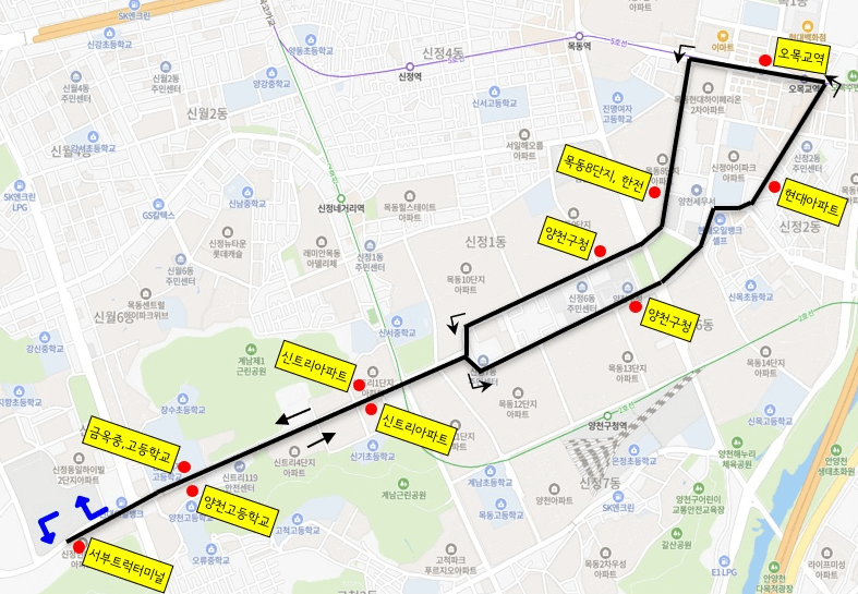 신정역(은행정)(15274) → 신정역2(3)번출구 → 신서고교,영상고교입구(15273) → 목동역·목동오거리(15272)
