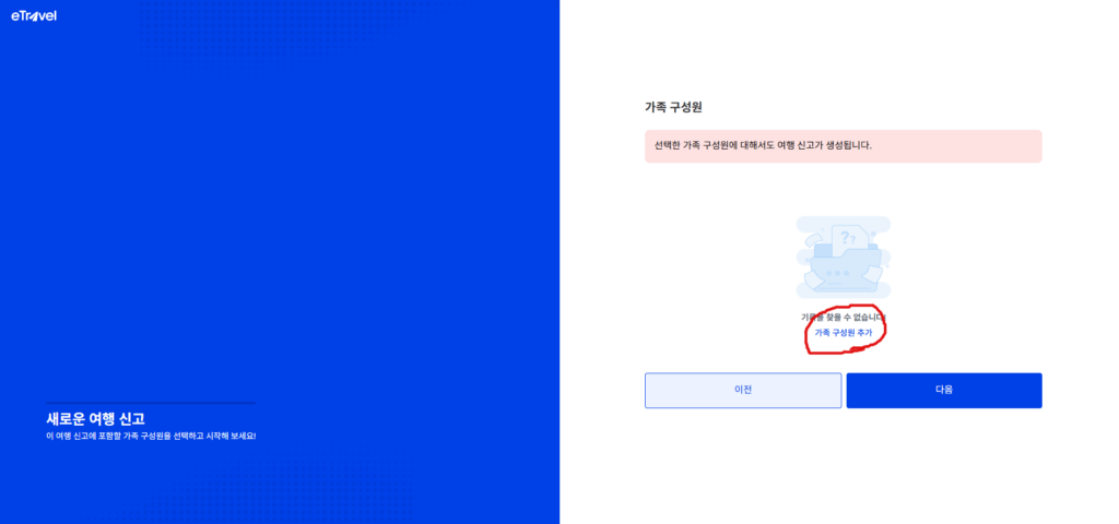 앞서 동반가족을 추가하였다면 여기에서 확인할 수 있고, 만약 못했더라도 여기에서 추가할 수 있어요. ‘가족 구성원 추가’를 클릭하세요.