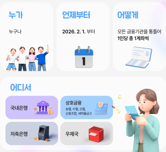 - 1인 1계좌 원칙: 모든 금융기관을 통틀어 딱 한 개의 계좌만 만들 수 있습니다. 여러 개를 만들어 한도를 늘리는 꼼수는 통하지 않습니다.